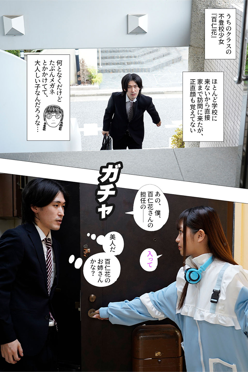 俺が担任しているクラスの不登校少女“百仁花”。ほとんど学校に来ないから直接家まで訪問に来たが、正直顔も覚えてない。何となくだけどたぶんメガネとかかけてて、大人しい子なんだろう…と思っていた。インターホンを鳴らすと美女が玄関に現れた。お姉さんかな?などと思っていると、めちゃくちゃ結局的なヤリ手で、あれよあれよという間に流されて生で挿入してしまった。「こ、こんな姿、百仁花さんに見られたら…」「え?私が百仁花だけど?w」俺は教師という立場でありながら、知らぬ間に生徒と性交という御法度を破いてしまった。動画で脅されるし、俺の人生これからどうなってしまうんだ…。