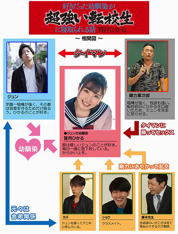 幼馴染みのジュンとひかる。ジュンは喧嘩っ早いが根は優しく、ひかるはジュンのそんなところが好きで、2人は両想いだった。ある日、剛力という屈強な転校生がやってくる。剛力が来て早々ひかるを口説いたため、ブチ切れたジュンは剛力に勝負を挑む。しかし学校一強かったジュンでも剛力には敵わずボコボコにされてしまう。「くっ…糞…。ひ、ひかるに、手を出すんじゃねえ…やめろーー!!」BSS(僕が先に好きだったのに)作品