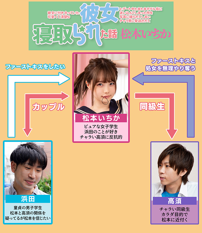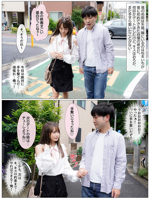 この子は松本いちか。僕に初めてできた自慢の彼女だ。セックスはおろかまだキスだってしてない。でも今日、ついに手繋ぎデートをした!次は必ずチューするぞ!なんて興奮しながら歩いてたらいつの間にか僕らはホテル街に迷い込んでしまい、その様子をクラスのチャラ男に写真に撮られてしまう…。「この写真をバラ撒かれたら二人とも退学だなwさあどうする?」ダメだ、いちか!そういつの言うことを聞くな!