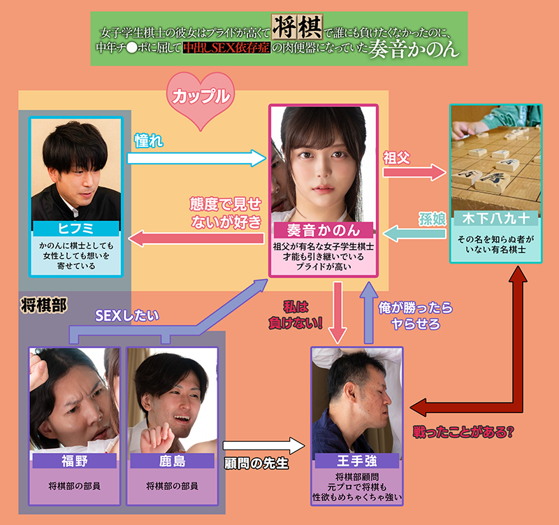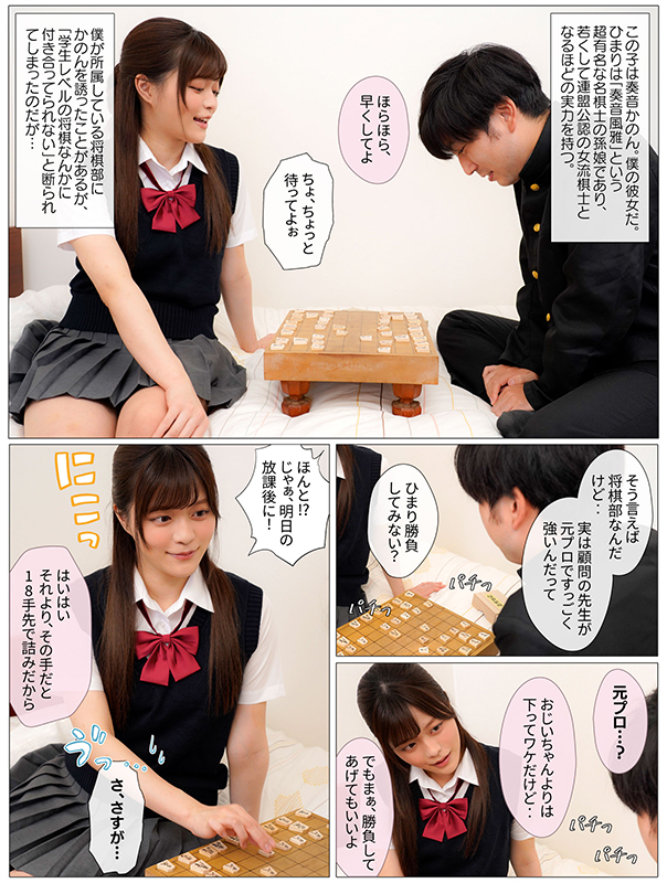 この子は僕の彼女、奏音かのん。かのんはこの国で知らない人はいない名棋士『奏音風雅』の孫娘であり、若くして連盟公認の女流棋士となるほどの実力を持つ。「所詮学生レベル」と言って学園の将棋部を下に見ていたが、将棋部顧問を務める王手先生にかのんはまさかのボロ負け。プライドが人一倍高いかのんは王手先生に再戦を申し込むが、「夜に家まで来たら相手してやる」と言われる。かのん!行っちゃダメだ!