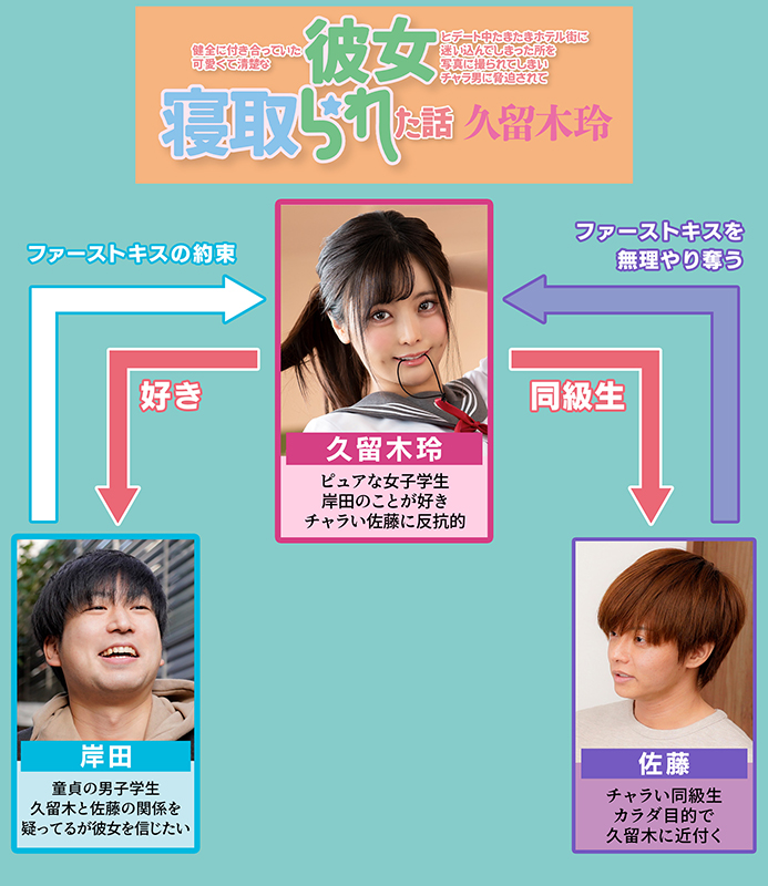 この子は久留木玲。僕に初めてできた自慢の彼女だ。セックスはおろかまだキスだってしてない。でも今日、ついに手繋ぎデートをした!次は必ずチューするぞ!なんて興奮しながら歩いてたらいつの間にか僕らはホテル街に迷い込んでしまい、その様子をクラスのチャラ男に写真に撮られてしまう…。「この写真をバラ撒かれたら二人とも退学だなwさあどうする?」ダメだ、玲!そういつの言うことを聞くな!