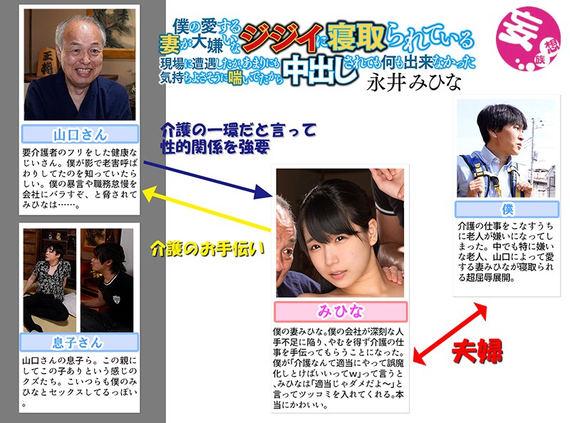 僕の働いている介護会社が人手不足に陥り、妻のみひながアシスタントとして働くことになった。僕らが担当する’山口さん’という老人は健康的な肉体を持っているのに、楽をしたいがために病を偽っている。そんな糞ジジイに妻が目の前で寝取られている。僕は助けに入ろうと思ったのだが出来なかった。何故なら妻は僕には見せたことのない快楽に満ちた表情で、嬉しそうにメスの声を上げて抱かれていたからだ。