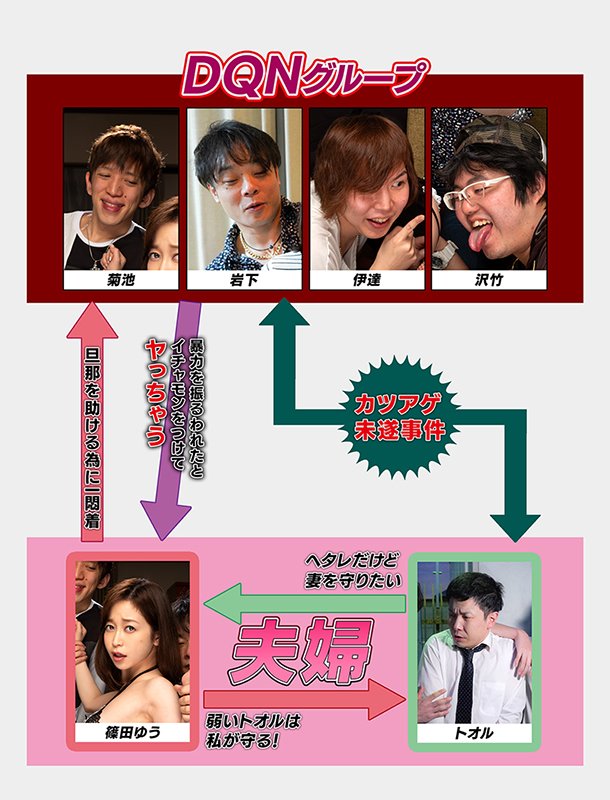 ラブラブ夫婦のゆうとトオル。トオルは極度の弱虫で、姉御肌のゆうはトオルに対し過保護。 ある日、トオルが近所のDQNにカツアゲをされているところにたまたまゆうが通りかかり、DQNを追い払う。逆恨みしたDQNはその後家を特定し、後日トオルがいない時間帯に家へ押しかけ、 ゆうに対して全裸土下座を強要するのであった…。