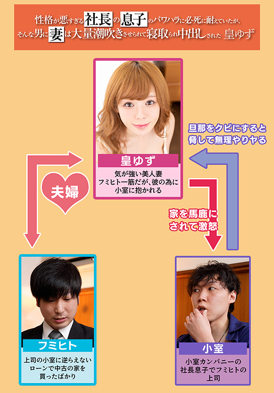 ローンで家を購入したばかりの新婚夫婦、フミヒトとゆずの家にフミヒトの上司であり社長の息子でもある小室がやって来る。「なんでこんな狭い家買ったの?俺に相談してくれたらもっとイイ家買えたのにw」と散々悪口を言うためゆずがブチ切れそうになるが、小室に逆らえないフミヒトはゆずを止める。小室はフミヒトに買い出しに行かせて、その隙にゆずを襲い、大量に潮を吹かせる!かつてないほど胸糞悪い寝取られ展開!