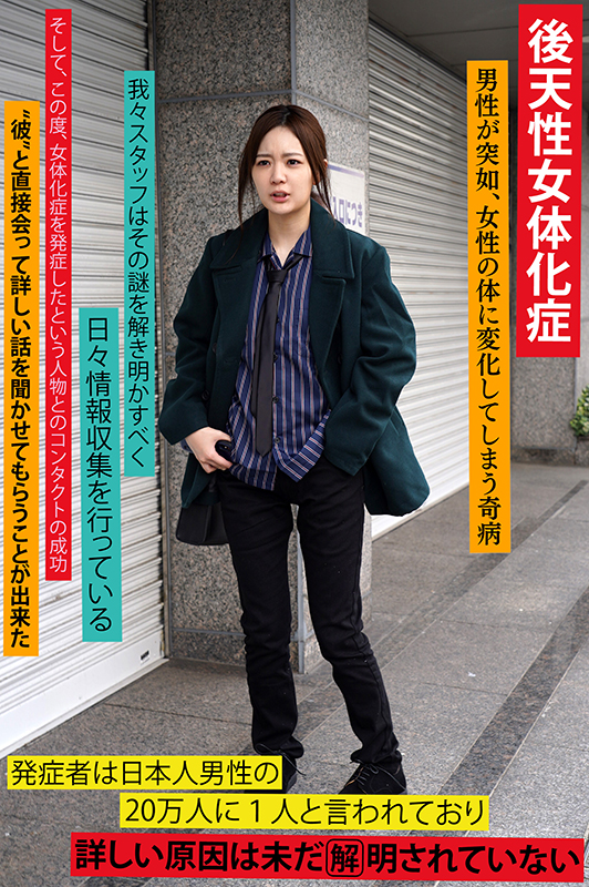 男性が女性の体に変化してしまう奇病’後天性女体化症’の謎に迫るため、女体化症を発症したとされる元男性を取材をした。会った時から彼は自分の胸を揉んでいた。柔らかくて気持ち良くて無意識に揉んでしまうらしい。身体検査のため脱いでもらったらこれは確かにかなりの神乳。形が整っていてピンク色した乳首はなかなかお目にかかれるものではない。取材です、と謳いながらさっそくスタッフたちが"味見"をしてゆく…。